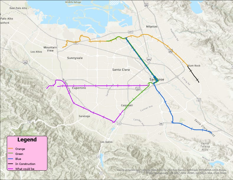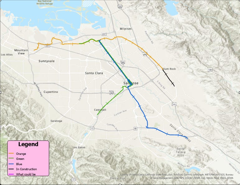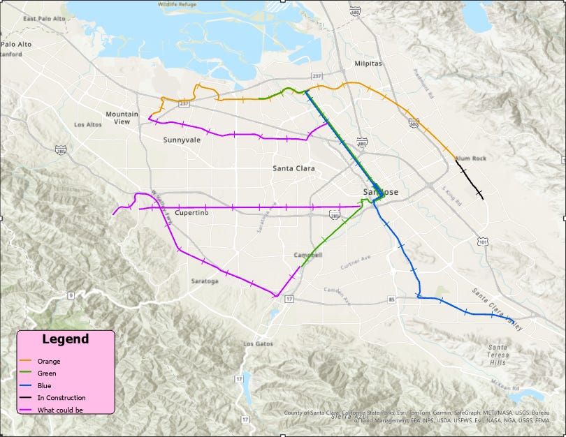 I don’t claim to know how to fix this system. I think it’s a big undertaking and I can imagine it’s not easy to handle for the VTA. But in an ideal world, I think a couple things could happen (spearheaded by people smarter and better connected than me). First, we would paint every light rail car the color of the line it corresponds to. Okay that’s (mostly) a joke. But for real, there is the possibility of the VTA using the Permanente Branch. Paraphrasing the linked SFGate article, tracks from the postwar era now owned by the Union Pacific are being looked into by the VTA as a potential new light rail expansion. Rod Diridon Sr is a supporter of this idea, although the further track would have to be constructed to loop back to Mountain View ideally. This will of course require Union Pacific to sell or rent the tracks, but it’s good that such a prominent figure in Diridon supports the idea. On the map above, the Permanent branch is the purple one that goes through Saratoga and up to Cupertino before trailing off a little bit west.