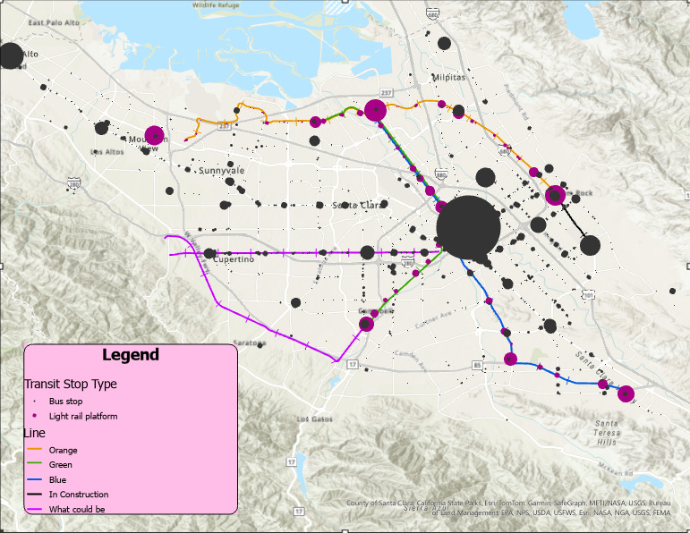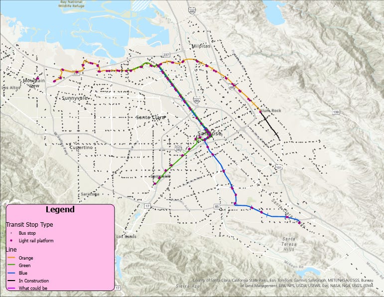 So, from this alone, we can see something glaring. Yes, there are no bus lines on this map (which is an extensive system by itself), but there are many places that are completely missing light rail! Namely, it would be Cupertino, Saratoga, and Los Gatos. Other neighborhoods like the Almaden Valley, Alviso, and Cambrian Park are also largely ignored. Sunnyvale and Santa Clara have stops, although located mostly in the northern parts of the cities. I guess they can get away with it since the centers of Sunnyvale and Santa Clara are covered by the Caltrain. San Jose is covered extensively here. We’ll get into the specifics of all that later, but let’s add bus stops and light rail stops to the map: